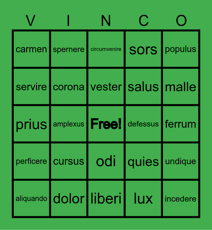 This bingo card has a free space and 29 words: aliquando, alii...alii, amplexus, audacia, carmen, circumvenire, corona, cursus, defessus, dolor, ferrum, incedere, liberi, lux, malle, obscurus, odi, perficere, populus, prius, quies, reducere, salus, servire, sors, spernere, undique, vester and vivus.