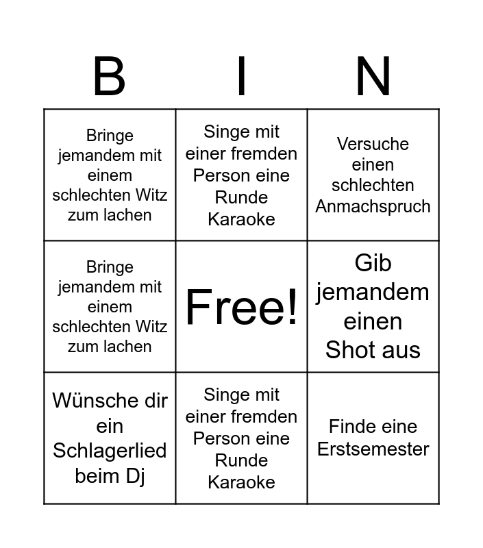 ⚠ This card has duplicate items: Finde eine Erstsemester (2), Gib jemandem einen Shot aus (2), Versuche einen schlechten Anmachspruch (2), Bringe jemandem mit einem schlechten Witz zum lachen (2), Finde jemanden der mit dir ein Selfie macht (2), Singe mit einer fremden Person eine Runde Karaoke (2), Wünsche dir ein Schlagerlied beim Dj (2), Besorge dir eine Nummer/Insta (2)