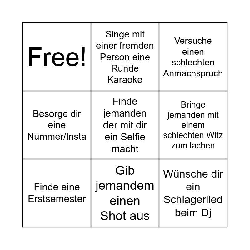 This bingo card has 9 words: Finde eine Erstsemester, Versuche einen schlechten Anmachspruch, Singe mit einer fremden Person eine Runde Karaoke, Besorge dir eine Nummer/Insta, Free!, Bringe jemanden mit einem schlechten Witz zum lachen, Finde jemanden der mit dir ein Selfie macht, Wünsche dir ein Schlagerlied beim Dj and Gib jemandem einen Shot aus.