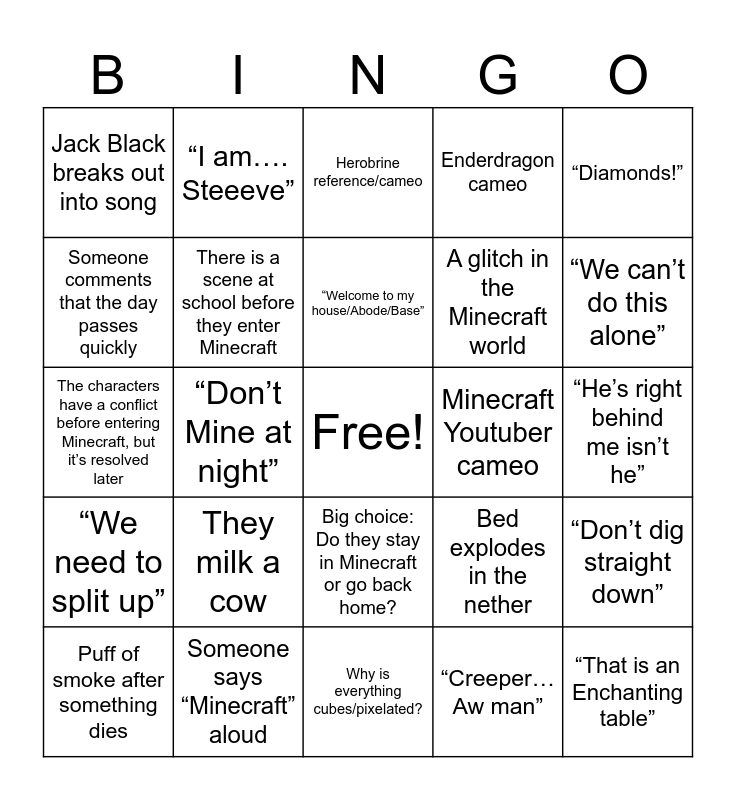 This bingo card has a free space and 25 words: They milk a cow, Why is everything cubes/pixelated?, “Welcome to my house/Abode/Base”, Puff of smoke after something dies, “Diamonds!”, Jack Black breaks out into song, Someone comments that the day passes quickly, “I am…. Steeeve”, Minecraft Youtuber cameo, Big choice: Do they stay in Minecraft or go back home?, A glitch in the Minecraft world, The characters have a conflict before entering Minecraft, but it’s resolved later, Bed explodes in the nether, “Don’t dig straight down”, There is a scene at school before they enter Minecraft, “We need to split up”, “He’s right behind me isn’t he”, Herobrine reference/cameo, “We can’t do this alone”, “Don’t Mine at night”, “That is an Enchanting table”, Someone says “Minecraft” aloud, “We need to split up”, Enderdragon cameo and “Creeper… Aw man”.
