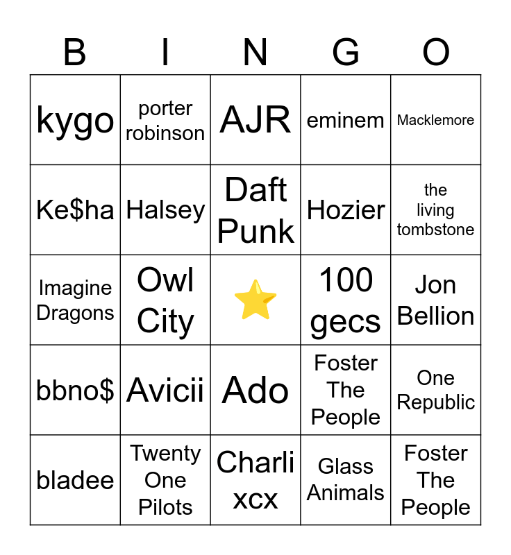 This bingo card has a free space and 24 words: Avicii, Twenty One Pilots, Daft Punk, bladee, Macklemore, kygo, Ke$ha, porter robinson, 100 gecs, Ado, Hozier, Imagine Dragons, Foster The People, One Republic, Halsey, Glass Animals, Jon Bellion, AJR, the living tombstone, Owl City, Foster The People, bbno$, eminem and Charli xcx.