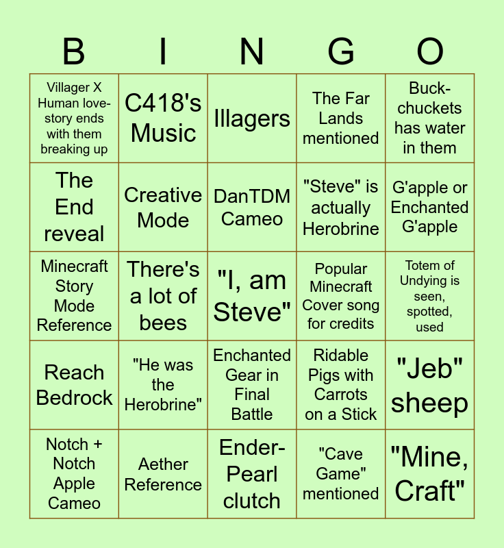 This bingo card has a free space and 24 words: "He was the Herobrine", Aether Reference, DanTDM Cameo, Notch + Notch Apple Cameo, Buck-chuckets has water in them, Villager X Human love-story ends with them breaking up, The End reveal, C418's Music, Popular Minecraft Cover song for credits, Enchanted Gear in Final Battle, "Steve" is actually Herobrine, Minecraft Story Mode Reference, Ridable Pigs with Carrots on a Stick, "Jeb" sheep, Creative Mode, "Cave Game" mentioned, Totem of Undying is seen, spotted, used, Illagers, G'apple or Enchanted G'apple, There's a lot of bees, "Mine, Craft", Reach Bedrock, The Far Lands mentioned and Ender-Pearl clutch.