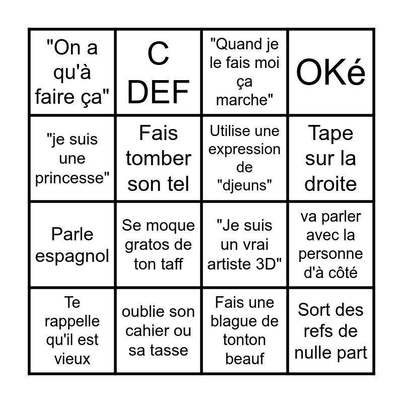 This bingo card has 16 words: oublie son cahier ou sa tasse, va parler avec la personne d'à côté, "Quand je le fais moi ça marche", "On a qu'à faire ça", Parle espagnol, C DEF, "Je suis un vrai artiste 3D", Fais une blague de tonton beauf, "je suis une princesse", Fais tomber son tel, Te rappelle qu'il est vieux, OKé, Se moque gratos de ton taff, Tape sur la droite, Utilise une expression de "djeuns" and Sort des refs de nulle part.
