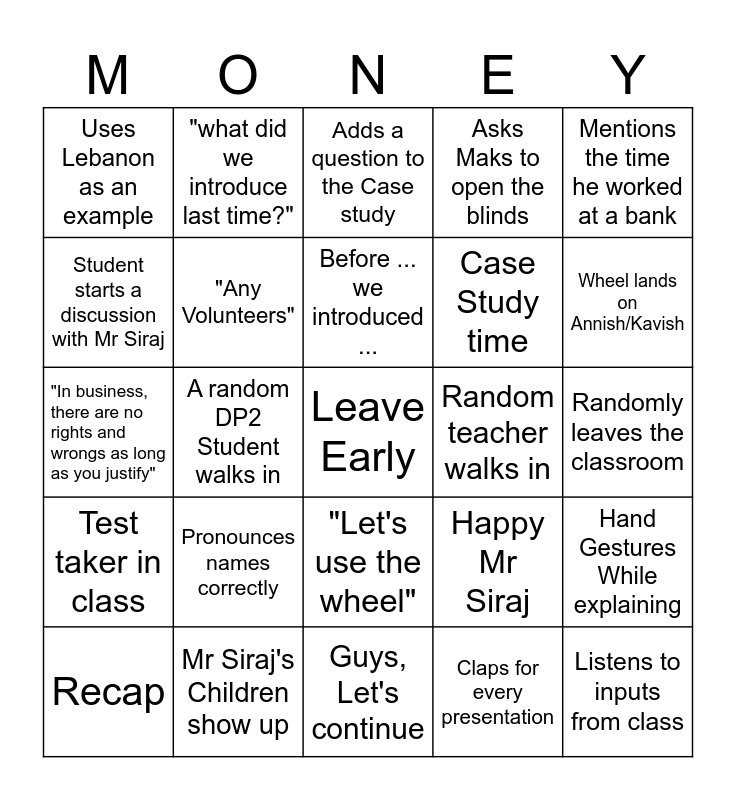 This bingo card has 25 words: Pronounces names correctly, Guys, Let's continue, Before ... we introduced ..., Recap, Mentions the time he worked at a bank, Uses Lebanon as an example, Student starts a discussion with Mr Siraj, "what did we introduce last time?", Random teacher walks in, "Let's use the wheel", Case Study time, "In business, there are no rights and wrongs as long as you justify", Happy Mr Siraj, Hand Gestures While explaining, "Any Volunteers", Listens to inputs from class, Randomly leaves the classroom, Adds a question to the Case study, Wheel lands on Annish/Kavish, A random DP2 Student walks in, Leave Early, Mr Siraj's Children show up, Test taker in class, Asks Maks to open the blinds and Claps for every presentation.