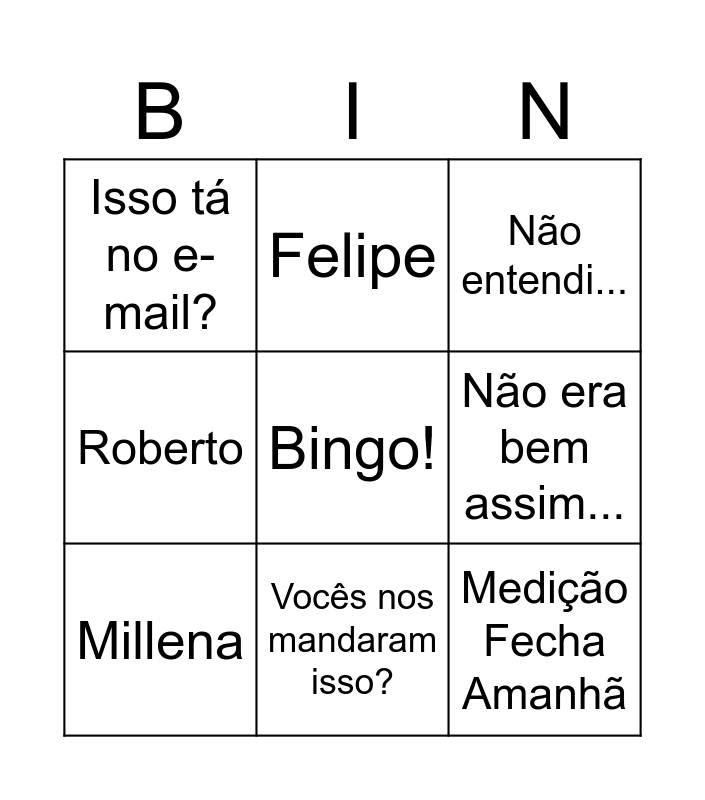 This bingo card has a free space and 14 words: Mariana, Lucas Soares, Millena, Felipe, Roberto, Medição Fecha Amanhã, Rerrar fecha amanhã, Tem projeto disso...?, Vocês nos mandaram isso?, Isso tá no e-mail?, Tem projeto disso...?, Não era bem assim..., Não entendi... and Ah, vi o arquivo errado....