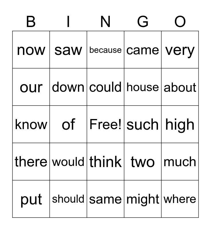 This bingo card has a free space and 24 words: would, should, could, put, very, now, our, saw, such, think, house, know, two, much, down, might, high, because, about, of, where, there, came and same.