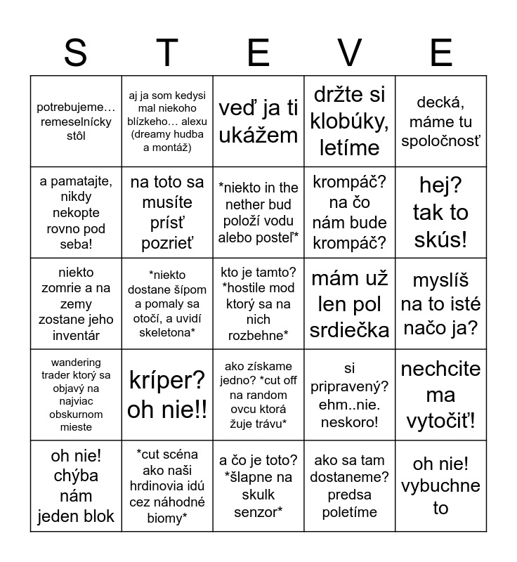 This bingo card has a free space and 24 words: kríper? oh nie!!, *cut scéna ako naši hrdinovia idú cez náhodné biomy*, *niekto in the nether bud položí vodu alebo posteľ*, oh nie! chýba nám jeden blok, decká, máme tu spoločnosť, potrebujeme…remeselnícky stôl, a pamatajte, nikdy nekopte rovno pod seba!, aj ja som kedysi mal niekoho blízkeho… alexu (dreamy hudba a montáž), mám už len pol srdiečka, ako získame jedno? *cut off na random ovcu ktorá žuje trávu*, krompáč? na čo nám bude krompáč?, niekto zomrie a na zemy zostane jeho inventár, si pripravený? ehm..nie. neskoro!, nechcite ma vytočiť!, na toto sa musíte prísť pozrieť, ako sa tam dostaneme? predsa poletíme, myslíš na to isté načo ja?, veď ja ti ukážem, hej? tak to skús!, *niekto dostane šípom a pomaly sa otočí, a uvidí skeletona*, oh nie! vybuchne to, wandering trader ktorý sa objavý na najviac obskurnom mieste, držte si klobúky, letíme and a čo je toto? *šlapne na skulk senzor*.