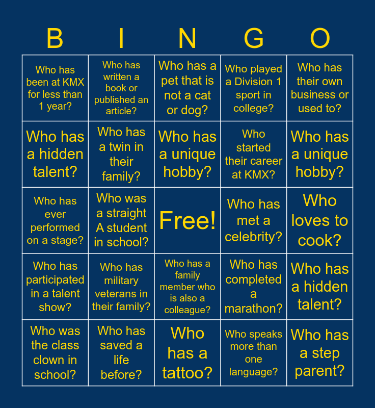 This bingo card has a free space and 29 words: Who was the class clown in school?, Who loves to dance?, Who was a straight A student in school?, Who has been to the Southern Hemisphere?, Who has been at KMX for less than 1 year?, Who has a pet that is not a cat or dog?, Who has a twin in their family?, Who has military veterans in their family?, Who has met a celebrity?, Who has saved a life before?, Who loves to cook?, Who has a step parent?, Who has a tattoo?, Who speaks more than one language?, Who has a unique hobby?, Who has lived in another country for more than a year?, Who has a family member who is also a colleague?, Who has participated in a talent show?, Who has their own business or used to?, Who has ever performed on a stage?, Who has completed a marathon?, Who has traveled to more than three countries?, Who started their career at KMX?, Who has a hidden talent?, Who played a Division 1 sport in college?, Who has written a book or published an article?, Who has a hidden talent?, Who has a unique hobby? and Who has a twin?.