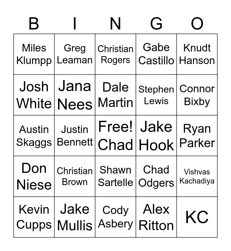 This bingo card has a free space and 24 words: Christian Brown, Jake Mullis, Dale Martin, Kevin Cupps, Knudt Hanson, Miles Klumpp, Josh White, Greg Leaman, Jake Hook, Shawn Sartelle, Stephen Lewis, Austin Skaggs, Chad Odgers, Vishvas Kachadiya, Jana Nees, Alex Ritton, Ryan Parker, Christian Rogers, Connor Bixby, Justin Bennett, KC, Don Niese, Gabe Castillo and Cody Asbery.