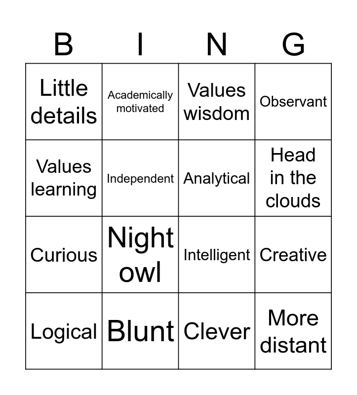 This bingo card has 16 words: Blunt, Creative, Values wisdom, Little details, Curious, Academically motivated, Intelligent, Clever, Values learning, Independent, Logical, Observant, Night owl, Head in the clouds, Analytical and More distant.