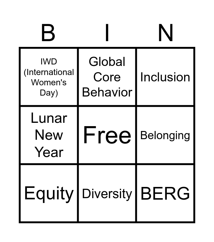 This bingo card has a free space and 11 words: Allyship, Diversity, BERG, Equity, Global Core Behavior, Inclusion, Belonging, Diwali, Lunar New Year, IWD (International Women's Day) and Psychological Safety.
