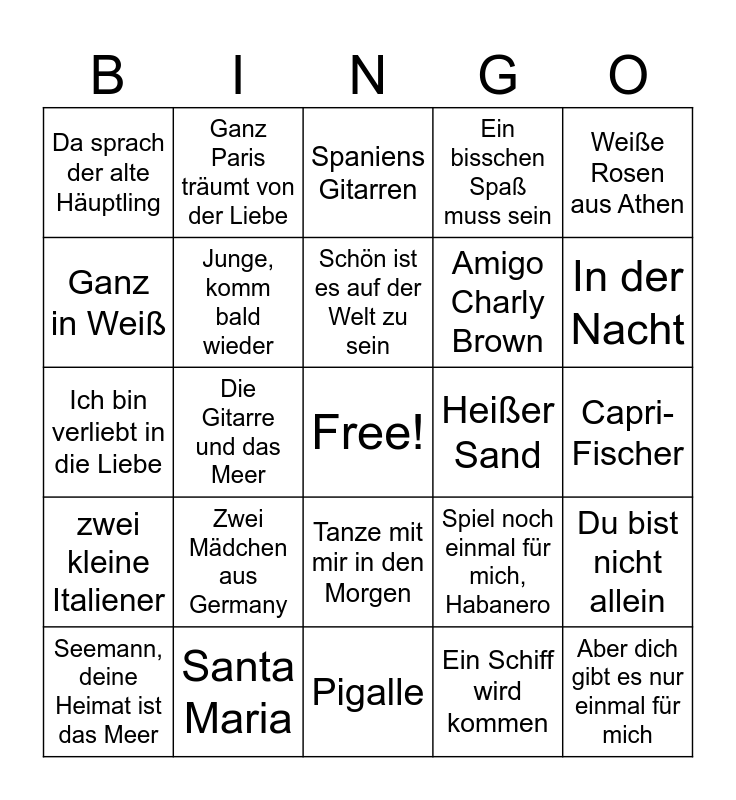 This bingo card has a free space and 24 words: Zwei Mädchen aus Germany, Santa Maria, Schön ist es auf der Welt zu sein, Seemann, deine Heimat ist das Meer, Weiße Rosen aus Athen, Da sprach der alte Häuptling, Ganz in Weiß, Ganz Paris träumt von der Liebe, Heißer Sand, Tanze mit mir in den Morgen, Amigo Charly Brown, Ich bin verliebt in die Liebe, Spiel noch einmal für mich, Habanero, Du bist nicht allein, Junge, komm bald wieder, Ein Schiff wird kommen, Capri-Fischer, Spaniens Gitarren, In der Nacht, Die Gitarre und das Meer, Aber dich gibt es nur einmal für mich, zwei kleine Italiener, Ein bisschen Spaß muss sein and Pigalle.