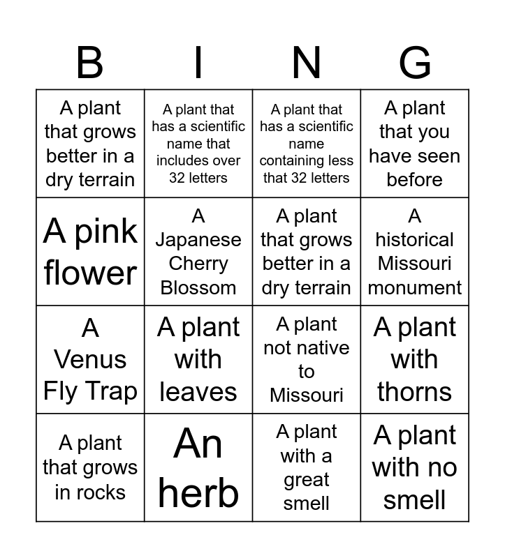 This bingo card has 24 words: Missouri Native Plant, A red plant, A historical Missouri monument, A purple flower, A pink flower, A plant that grows better in a dry terrain, A Japanese Cherry Blossom, A plant that has a scientific name that includes over 32 letters, An herb, An aquatic plant, A Venus Fly Trap, A plant not native to Missouri, A fruit bearing plant, A plant with no flowers, A plant that grows better in a dry terrain, A tree, A plant with a great smell, A plant that has a scientific name containing less that 32 letters, A plant with leaves, A plant with thorns, A plant that grows in rocks, A plant with no smell, A plant that you have seen before and A plant that grows better in a moist environment.