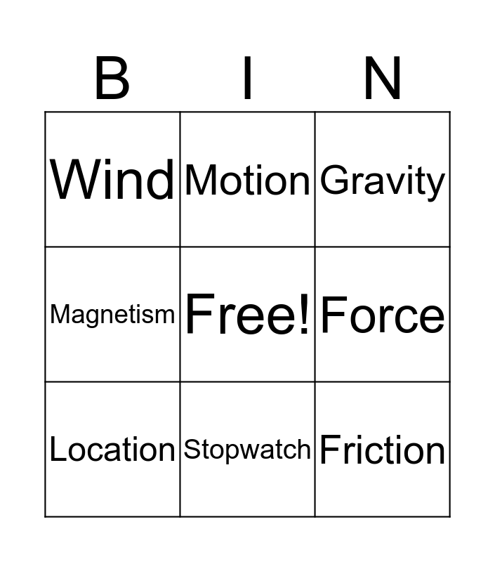 This bingo card has a free space and 8 words: Force, Gravity, Motion, Location, Wind, Friction, Magnetism and Stopwatch.