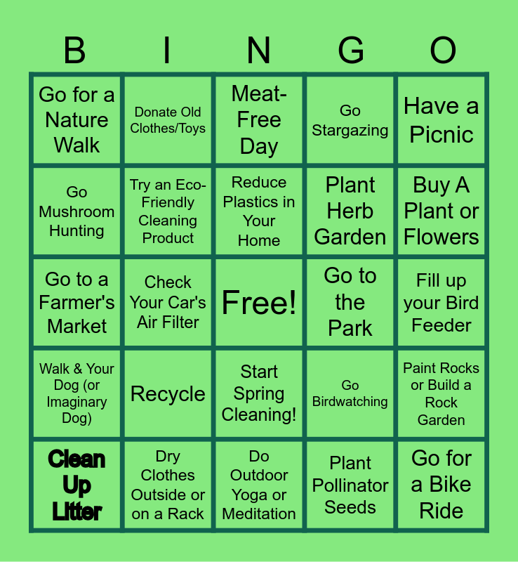 This bingo card has a free space and 24 words: Clean Up Litter, Recycle, Reduce Plastics in Your Home, Plant Pollinator Seeds, Have a Picnic, Go for a Nature Walk, Donate Old Clothes/Toys, Meat-Free Day, Go to the Park, Fill up your Bird Feeder, Go to a Farmer's Market, Try an Eco-Friendly Cleaning Product, Go Birdwatching, Paint Rocks or Build a Rock Garden, Go Mushroom Hunting, Dry Clothes Outside or on a Rack, Do Outdoor Yoga or Meditation, Go Stargazing, Buy A Plant or Flowers, Walk & Your Dog (or Imaginary Dog), Check Your Car's Air Filter, Start Spring Cleaning!, Plant Herb Garden and Go for a Bike Ride.