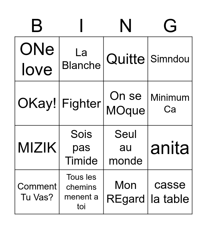 This bingo card has 16 words: Tous les chemins menent a toi, anita, Quitte, ONe love, MIZIK, La Blanche, Seul au monde, Mon REgard, OKay!, Fighter, Comment Tu Vas?, Simndou, Sois pas Timide, Minimum Ca, On se MOque and casse la table.