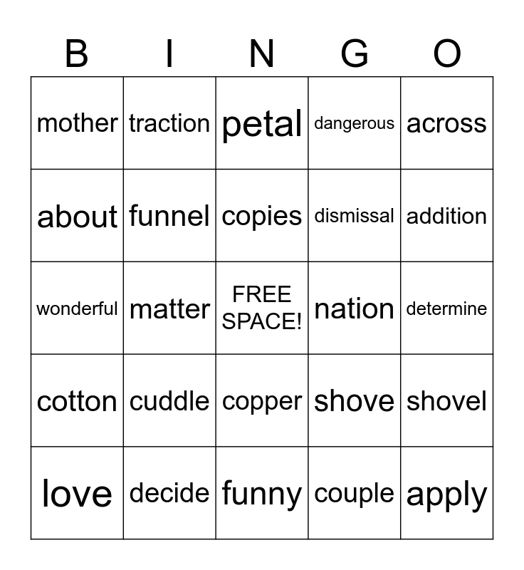 This bingo card has a free space and 24 words: cuddle, decide, copies, love, across, mother, about, traction, nation, copper, dismissal, wonderful, shove, shovel, funnel, couple, determine, petal, addition, matter, apply, cotton, dangerous and funny.