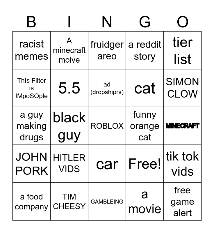 This bingo card has 25 words: HITLER VIDS, GAMBLEING, ad (dropshiprs), a food company, tier list, racist memes, ThIs Filter is IMpoSOple, A minecraft moive, funny orange cat, car, cat, a guy making drugs, Free!, tik tok vids, 5.5, free game alert, MINECRAFT, fruidger areo, SIMON CLOW, black guy, ROBLOX, TIM CHEESY, JOHN PORK, a reddit story and a movie.