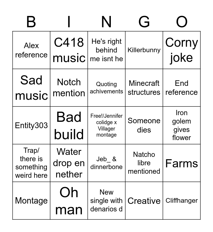 This bingo card has a free space and 29 words: Herobrine, Oh man, He's right behind me isnt he, YouTube reference, Corny joke, Alex reference, Notch mention, Quoting achivements, Someone dies, Farms, Montage, Bad build, Creative, Cliffhanger, Entity303, Musical, New single with denarios d, Natcho libre mentioned, End reference, Trap/ there is something weird here, Water drop en nether, Sleeping in nether, Minecraft structures, Iron golem gives flower, Sad music, C418 music, Jeb_ & dinnerbone, Killerbunny and Wither/warden.