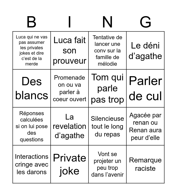 This bingo card has 16 words: Private joke, Agacée par renan ou Renan aura peur d’elle, Tentative de lancer une conv sur la famille de mélodie, Luca qui ne vas pas assumer les privates jokes et dire c’est de la merde, Réponses calculées si on lui pose des questions, Luca fait son prouveur, Silencieuse tout le long du repas, Vont se projeter un peu trop dans l’avenir, Des blancs, Promenade on ou va parler à coeur ouvert, Interactions cringe avec les darons, Le déni d’agathe, La revelation d’agathe, Parler de cul, Tom qui parle pas trop and Remarque raciste.