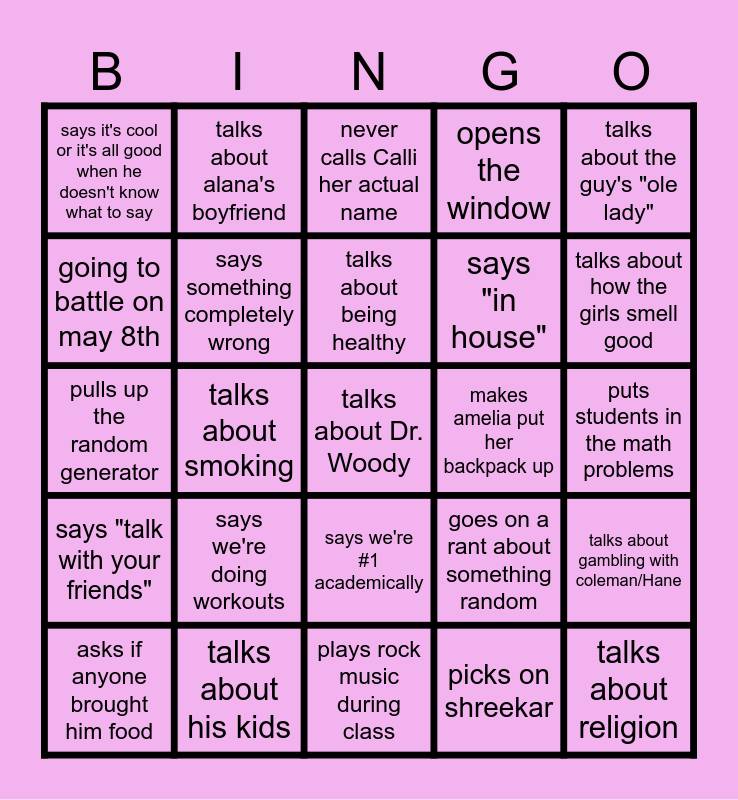This bingo card has a free space and 24 words: says we're doing workouts, talks about his kids, talks about being healthy, asks if anyone brought him food, talks about the guy's "ole lady", says it's cool or it's all good when he doesn't know what to say, going to battle on may 8th, talks about alana's boyfriend, makes amelia put her backpack up, says we're #1 academically, says "in house", pulls up the random generator, goes on a rant about something random, talks about gambling with coleman/Hane, says something completely wrong, picks on shreekar, puts students in the math problems, never calls Calli her actual name, talks about how the girls smell good, talks about smoking, talks about religion, says "talk with your friends", opens the window and plays rock music during class.