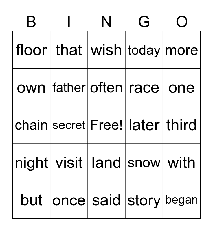 This bingo card has a free space and 24 words: visit, once, often, but, more, floor, own, that, later, land, race, chain, snow, with, father, story, third, wish, one, secret, began, night, today and said.