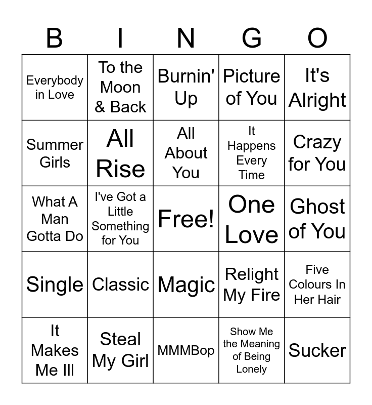 This bingo card has a free space and 49 words: Everybody (Backstreet's Back), Sucker, As Long as You Love Me, MMMBop, Classic, Step by Step, To the Moon & Back, Best Song Ever, Summer Girls, Year 3000, All Rise, Picture of You, Five Colours In Her Hair, Relight My Fire, Butter, Back Here, All About You, One Love, Crazy, It's Alright, I've Got a Little Something for You, Show Me the Meaning of Being Lonely, Everybody in Love, It Happens Every Time, Give Me Just One Night (Una Noche), Crazy for You, It Makes Me Ill, The Game Is Over, Magic, Single, Summer Love, Better Days, Full Service, Story of My Life, Steal My Girl, Right Now, No Control, Clouds, Ghost of You, I Want You Back, Dancing Machine, The Love You Save, (Come 'Round Here) I'm The One You Need, Leave Before You Love Me, What A Man Gotta Do, Burnin' Up, My Universe, FAKE LOVE and Run BTS.