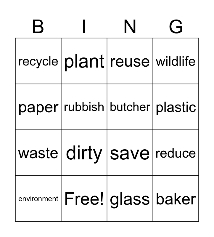 This bingo card has 16 words: Free!, reduce, reuse, recycle, waste, plant, save, glass, paper, rubbish, environment, wildlife, dirty, plastic, butcher and baker.