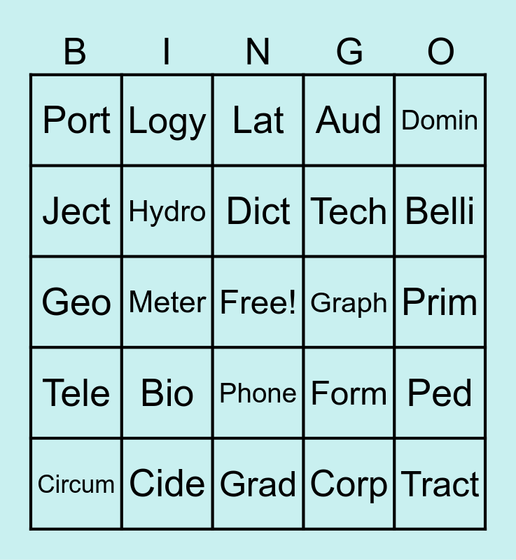 This bingo card has a free space and 24 words: Bio, Cide, Dict, Circum, Domin, Port, Ject, Logy, Graph, Phone, Tech, Geo, Form, Ped, Hydro, Corp, Prim, Lat, Belli, Meter, Tract, Tele, Aud and Grad.