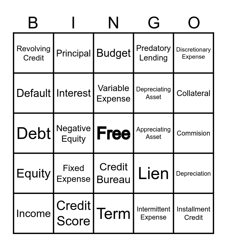 This bingo card has a free space and 24 words: Income, Fixed Expense, Variable Expense, Intermittent Expense, Discretionary Expense, Revolving Credit, Principal, Budget, Appreciating Asset, Commision, Debt, Interest, Lien, Depreciation, Default, Credit Score, Term, Predatory Lending, Collateral, Equity, Negative Equity, Credit Bureau, Depreciating Asset and Installment Credit.