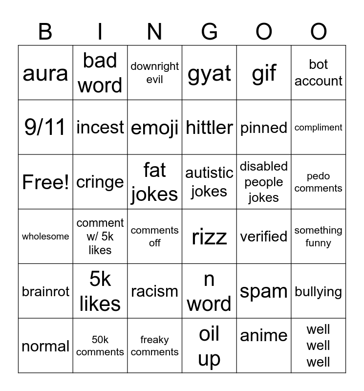 This bingo card has 36 words: n word, racism, oil up, 9/11, wholesome, autistic jokes, incest, freaky comments, gif, spam, compliment, gyat, bullying, cringe, hittler, aura, brainrot, disabled people jokes, Free!, downright evil, fat jokes, comment w/ 5k likes, rizz, comments off, verified, bad word, pinned, 50k comments, emoji, bot account, well well well, normal, something funny, pedo comments, 5k likes and anime.