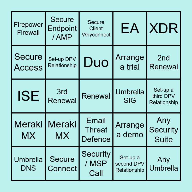 This bingo card has a free space and 24 words: Meraki MX, Secure Connect, Duo, Umbrella DNS, XDR, Firepower Firewall, Secure Access, Secure Endpoint / AMP, Umbrella SIG, Email Threat Defence, Arrange a trial, ISE, Arrange a demo, Any Security Suite, Set-up DPV Relationship, Set-up a second DPV Relationship, Set-up a third DPV Relationship, Secure Client /Anyconnect, 2nd Renewal, 3rd Renewal, Any Umbrella, Meraki MX, EA and Security / MSP Call.
