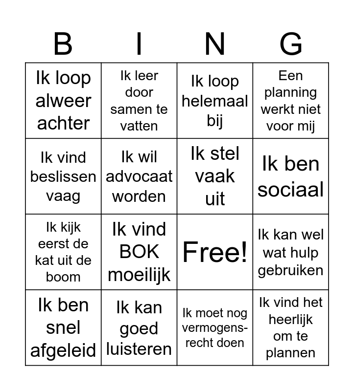 This bingo card has 21 words: Ik kan goed luisteren, Ik heb mijn p gehaald, Ik leer door samen te vatten, Ik leer het liefst alleen, Ik moet nog vermogens-recht doen, Ik stel vaak uit, Ik loop alweer achter, Ik loop helemaal bij, Free!, Ik ben sociaal, Ik kijk eerst de kat uit de boom, Een planning werkt niet voor mij, Ik vind het heerlijk om te plannen, Ik werk graag samen, Ik wil advocaat worden, ik wil hierna doorstuderen, Ik ben snel afgeleid, Ik vind BOK moeilijk, Ik vind beslissen vaag, Ik kan wel wat hulp gebruiken and Ik moet nog burgerlijk procesrecht.