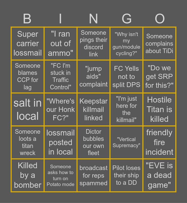 This bingo card has a free space and 24 words: lossmail posted in local, Someone asks how to turn on Potato mode, "jump aids" complaint, Killed by a bomber, Someone complains about TiDi, Super carrier lossmail, Someone blames CCP for lag, "I ran out of ammo", "I'm just here for the killmail", Dictor bubbles our own fleet, FC Yells not to split DPS, salt in local, "Vertical Supremacy", friendly fire incident, "FC I'm stuck in Traffic Control", Pilot loses their ship to a DD, Hostile Titan is killed, Someone pings their discord link, "Do we get SRP for this?", "Where's our Honk FC?", "EVE is a dead game", Someone loots a titan wreck, "Why isn't my gun/module cycling?" and broadcast for reps spammed.