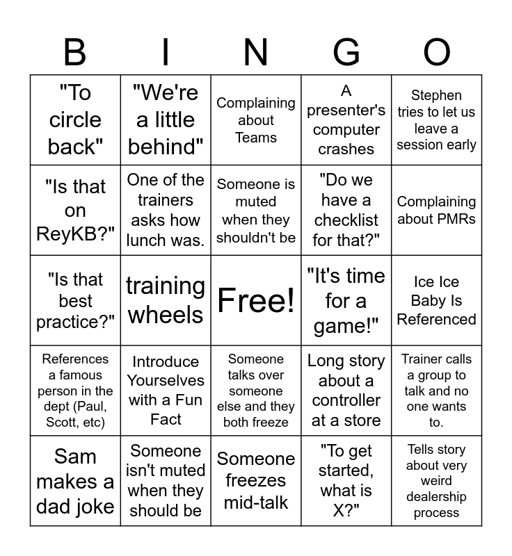 This bingo card has a free space and 24 words: Introduce Yourselves with a Fun Fact, Someone isn't muted when they should be, Someone is muted when they shouldn't be, Sam makes a dad joke, Stephen tries to let us leave a session early, "To circle back", "Is that on ReyKB?", "We're a little behind", "It's time for a game!", Someone talks over someone else and they both freeze, "Do we have a checklist for that?", "Is that best practice?", Long story about a controller at a store, Trainer calls a group to talk and no one wants to., One of the trainers asks how lunch was., "To get started, what is X?", Ice Ice Baby Is Referenced, Complaining about Teams, Complaining about PMRs, training wheels, Tells story about very weird dealership process, References a famous person in the dept (Paul, Scott, etc), A presenter's computer crashes and Someone freezes mid-talk.