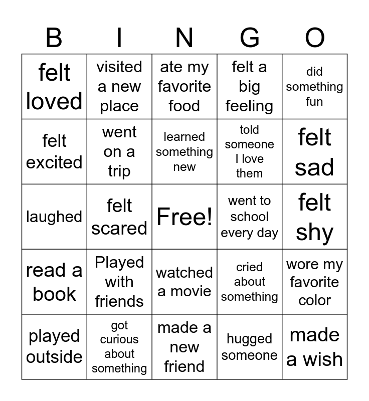 This bingo card has a free space and 24 words: Played with friends, got curious about something, learned something new, played outside, did something fun, felt loved, felt excited, visited a new place, went to school every day, watched a movie, told someone I love them, laughed, cried about something, wore my favorite color, went on a trip, hugged someone, felt shy, ate my favorite food, felt sad, felt scared, made a wish, read a book, felt a big feeling and made a new friend.