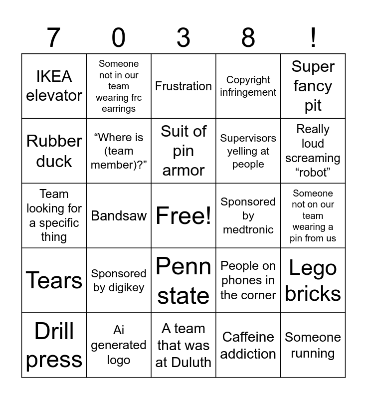 This bingo card has a free space and 26 words: Penn state, Caffeine addiction, Suit of pin armor, Ai generated logo, Super fancy pit, IKEA elevator, Rubber duck, Someone not in our team wearing frc earrings, Someone not on our team wearing a pin from us, People on phones in the corner, Supervisors yelling at people, Team looking for a specific thing, Lego bricks, Drill press, Bandsaw, Lost freshman, Copyright infringement, Tears, Frustration, Someone running, Really loud screaming “robot”, A team that was at Duluth, Sponsored by medtronic, Sponsored by digikey, “Where is (team member)?” and Energy drink cans (empty).