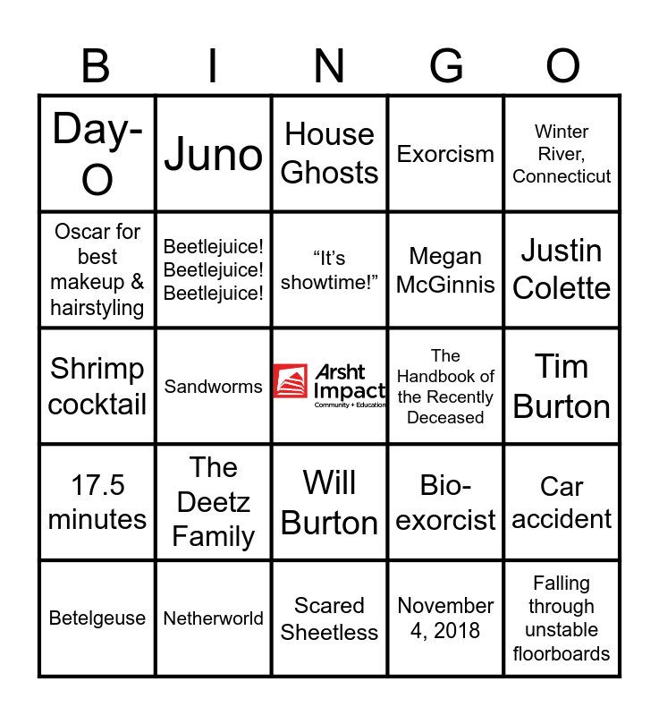 This bingo card has a free space and 30 words: Netherworld, March 30, 1988, Sandworms, Madison Mosley, Day-O, House Ghosts, Beetlejuice! Beetlejuice! Beetlejuice!, Will Burton, The Handbook of the Recently Deceased, Scared Sheetless, Tim Burton, Falling through unstable floorboards, November 4, 2018, Yellow, Justin Colette, 8 years, Bio-exorcist, 17.5 minutes, The Deetz Family, Winter River, Connecticut, Shrimp cocktail, Danny Elfman, Juno, Megan McGinnis, Oscar for best makeup & hairstyling, Exorcism, Car accident, Betelgeuse, “It’s showtime!” and 92 minutes.