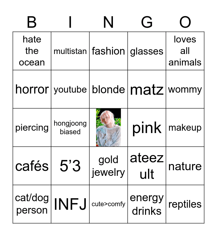This bingo card has a free space and 24 words: 5’3, INFJ, blonde, cat/dog person, loves all animals, hate the ocean, horror, multistan, pink, gold jewelry, matz, piercing, ateez ult, nature, youtube, energy drinks, makeup, fashion, wommy, hongjoong biased, reptiles, cafés, glasses and cute>comfy.