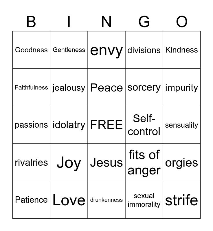 This bingo card has a free space and 24 words: Joy, Love, Peace, Patience, Kindness, Goodness, Faithfulness, Gentleness, Self-control, Jesus, sorcery, passions, fits of anger, orgies, jealousy, sexual immorality, sensuality, envy, impurity, idolatry, strife, rivalries, divisions and drunkenness.