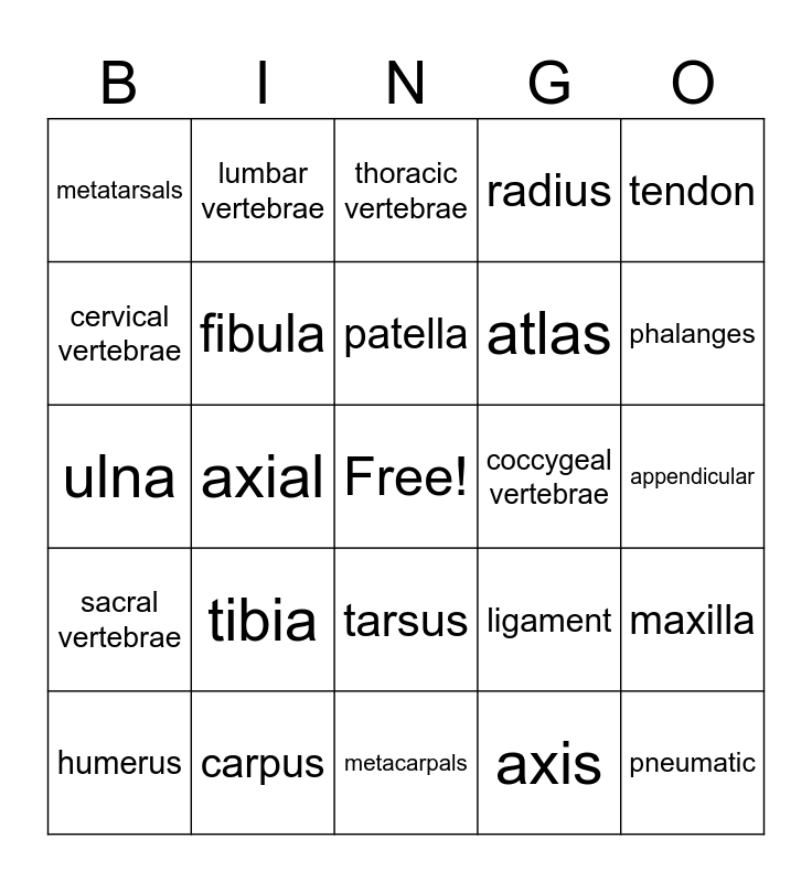 This bingo card has a free space and 28 words: maxilla, mandible, atlas, axis, cervical vertebrae, thoracic vertebrae, lumbar vertebrae, sacral vertebrae, coccygeal vertebrae, humerus, ulna, radius, carpus, metacarpals, phalanges, femur, tibia, fibula, patella, tarsus, metatarsals, sesamoid, pneumatic, axial, appendicular, ligament, tendon and sternum.