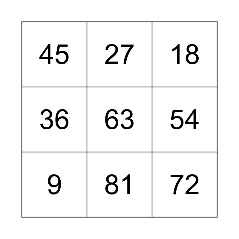 This bingo card has 9 words: 9, 18, 27, 36, 45, 54, 63, 72 and 81.