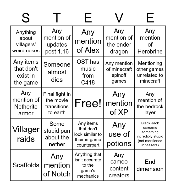 This bingo card has a free space and 24 words: Some stupid pun about the nether, Any mention of Notch, OST has music from C418, Scaffolds, Any mention of Herobrine, Anything about villagers' weird noses, Any items that don't exist in the game, Any mention of updates post 1.16, Any mention of XP, Any items that don't look similar to their in-game counterpart, Any mention of minecraft spinoff games, Any mention of Netherite armor, Any use of potions, Black Jack screams something incredibly stupid (not mentioned in teasers), Someone almost dies, Any cameo content creators, Any mention of the bedrock layer, Any mention of Alex, Mentioning other games unrelated to minecraft, Final fight in the movie transitions to earth, End dimension, Villager raids, Any mention of the ender dragon and Anything that isn't accurate to the game's mechanics.