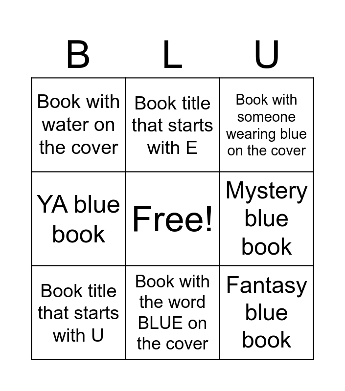 This bingo card has a free space and 14 words: Book title that starts with B, Book title that starts with L, Book title that starts with U, Book title that starts with E, YA blue book, Fantasy blue book, Blue book with a person on the cover, Blue book with a tree on the cover, Book with the word BLUE on the cover, Book with water on the cover, Thriller blue book, Mystery blue book, Book with someone wearing blue on the cover and A blue book published before 2020.
