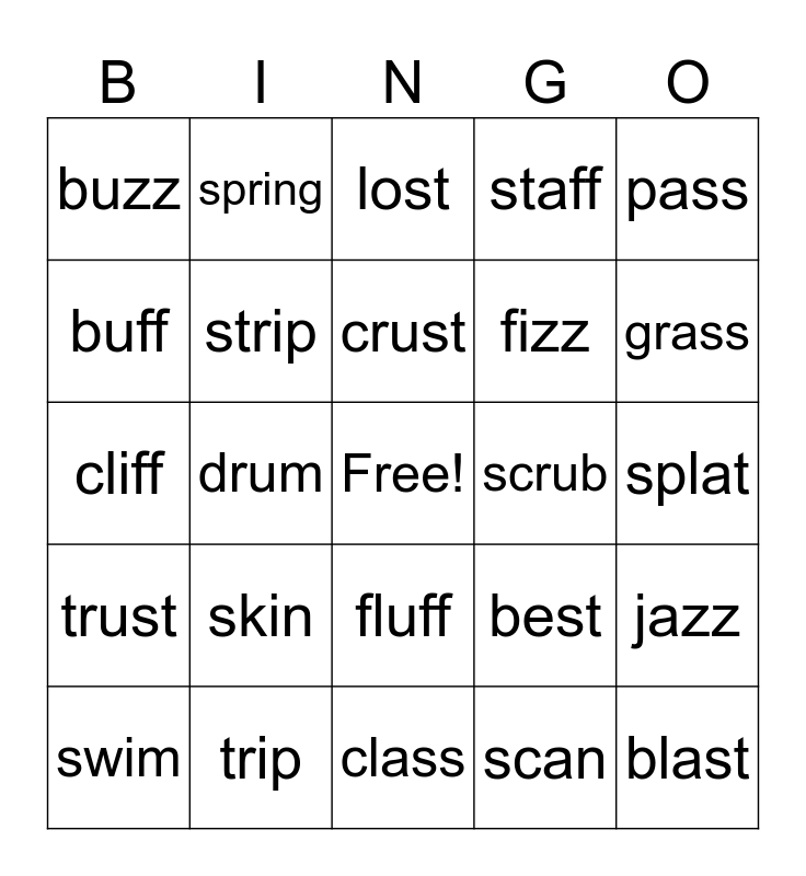 This bingo card has a free space and 24 words: skin, trip, crust, swim, pass, buzz, buff, spring, scrub, fluff, fizz, cliff, best, jazz, strip, scan, splat, lost, grass, drum, blast, trust, staff and class.