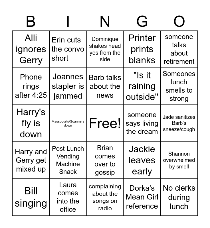 This bingo card has a free space and 24 words: Post-Lunch Vending Machine Snack, Laura comes into the office, Barb talks about the news, Bill singing, someone talks about retirement, Alli ignores Gerry, Phone rings after 4:25, Erin cuts the convo short, someone says living the dream, Brian comes over to gossip, "Is it raining outside", Harry's fly is down, Jackie leaves early, Shannon overwhelmed by smell, Joannes stapler is jammed, Dorka's Mean Girl reference, Jade sanitizes Barb's sneeze/cough, Dominique shakes head yes from the side, Someones lunch smells to strong, Masscourts/Scanners down, No clerks during lunch, Harry and Gerry get mixed up, Printer prints blanks and complaining about the songs on radio.