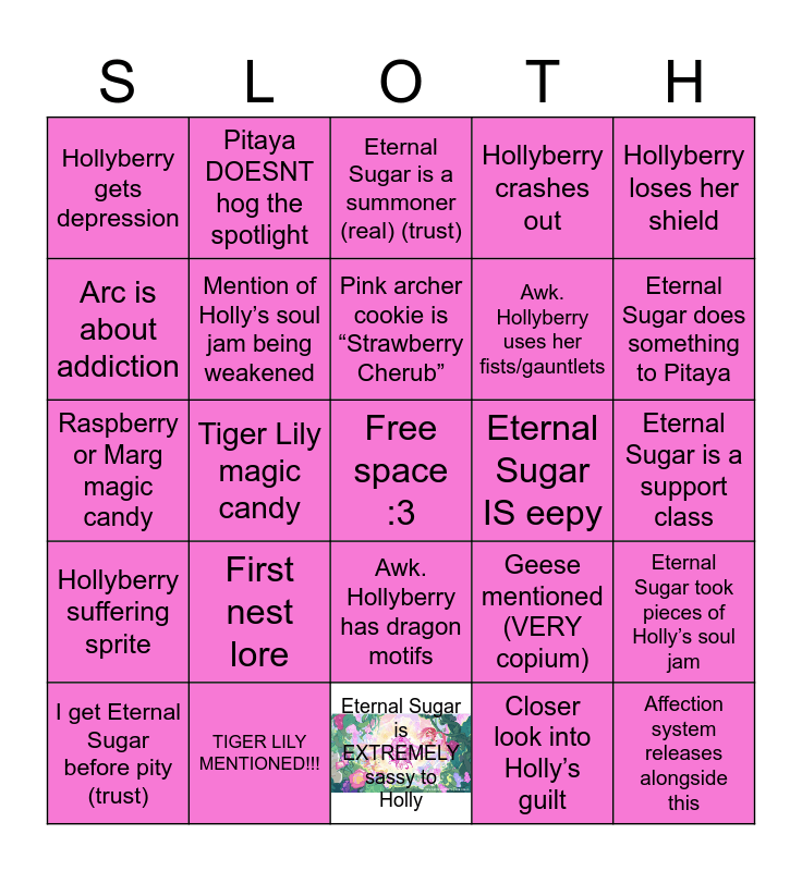 This bingo card has 1 images, a free space and 24 words: First nest lore, TIGER LILY MENTIONED!!!, Pink archer cookie is “Strawberry Cherub”, I get Eternal Sugar before pity (trust), Hollyberry loses her shield, Hollyberry gets depression, Arc is about addiction, Pitaya DOESNT hog the spotlight, Eternal Sugar IS eepy, Awk. Hollyberry has dragon motifs, Awk. Hollyberry uses her fists/gauntlets, Raspberry or Marg magic candy, Geese mentioned (VERY copium), Eternal Sugar took pieces of Holly’s soul jam, Mention of Holly’s soul jam being weakened, Closer look into Holly’s guilt, Eternal Sugar is a support class, Eternal Sugar is a summoner (real) (trust), Eternal Sugar does something to Pitaya, Tiger Lily magic candy, Affection system releases alongside this, Hollyberry suffering sprite, Hollyberry crashes out and Eternal Sugar is EXTREMELY sassy to Holly.