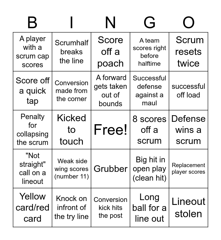 This bingo card has a free space and 24 words: Weak side wing scores (number 11), Knock on infront of the try line, A forward gets taken out of bounds, Yellow card/red card, Scrum resets twice, A player with a scrum cap scores, Score off a quick tap, Scrumhalf breaks the line, 8 scores off a scrum, Grubber, Successful defense against a maul, Penalty for collapsing the scrum, Big hit in open play (clean hit), Replacement player scores, Conversion made from the corner, Long ball for a line out, Defense wins a scrum, Score off a poach, successful off load, Kicked to touch, Lineout stolen, "Not straight" call on a lineout, A team scores right before halftime and Conversion kick hits the post.