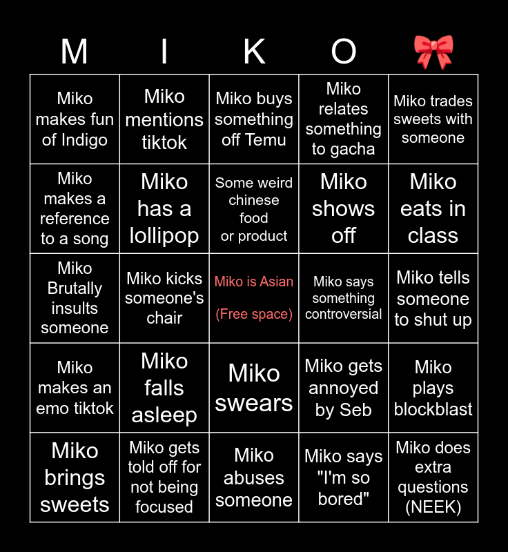 This bingo card has a free space and 24 words: Miko falls asleep, Miko gets told off for not being focused, Some weird chinese food or product, Miko brings sweets, Miko trades sweets with someone, Miko makes fun of Indigo, Miko makes a reference to a song, Miko mentions tiktok, Miko says something controversial, Miko swears, Miko shows off, Miko Brutally insults someone, Miko gets annoyed by Seb, Miko plays blockblast, Miko has a lollipop, Miko says "I'm so bored", Miko tells someone to shut up, Miko buys something off Temu, Miko eats in class, Miko kicks someone's chair, Miko does extra questions (NEEK), Miko makes an emo tiktok, Miko relates something to gacha and Miko abuses someone.