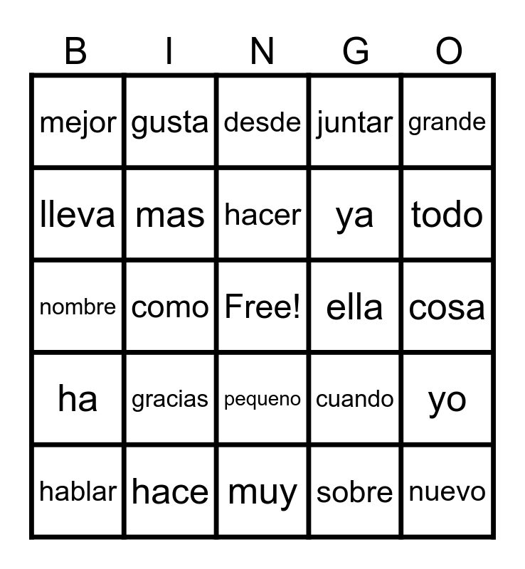 This bingo card has a free space and 29 words: hablar, quienes, como, siempre, mejor, desde, mas, gracias, ella, hace, cosa, nuevo, muy, sobre, todo, libro, pequeno, ha, grande, nombre, cuando, dentro, ya, lleva, juntar, gusta, yo, hacer and quiere.